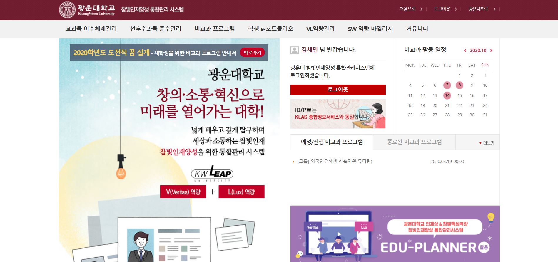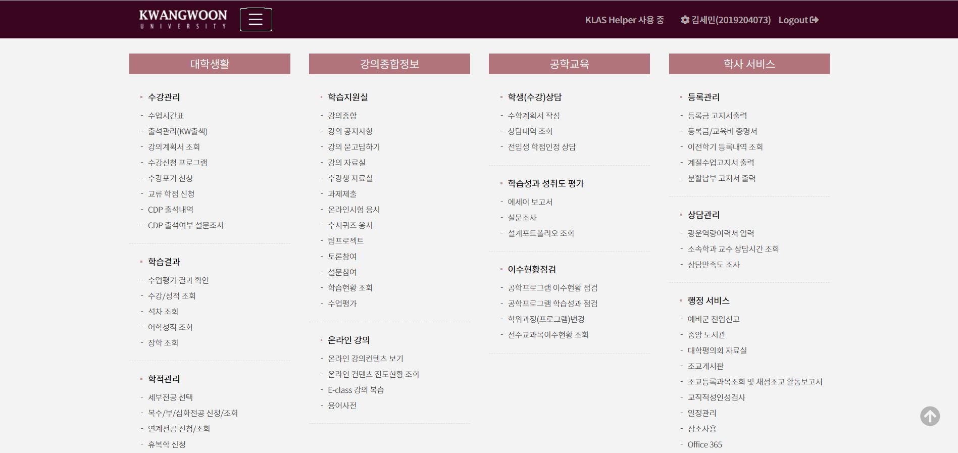학교 생활에 대한 전반적인 도움을 주는 페이지입니다. 현 시점에서는 온라인 강의 수강이 KLAS의 주 목적이며, 이외에도 강의 계획서, 공지사항, 출석체크 등의 기능이 있습니다.