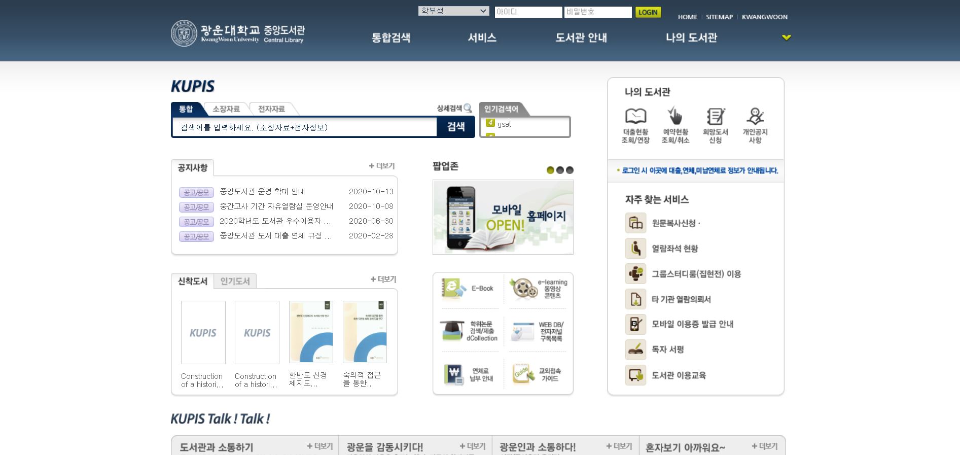 광운대학교 중앙도서관 공식 홈페이지입니다. 공지사항, 신착도서, 예약 현황 등에 대한 정보를 제공 받을 수 있습니다.